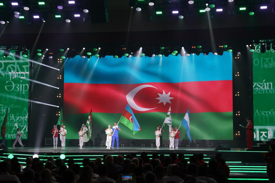 The ceremony featured a video highlighting Russia’s path of development, followed by a parade of the flag bearers of countries participating in the Games. The Azerbaijani tricolor was carried by Ziya Mammadzada, silver and bronze medalist of the Amber Oars international regatta, gold medalist of the President-Cup-2015 international regatta.