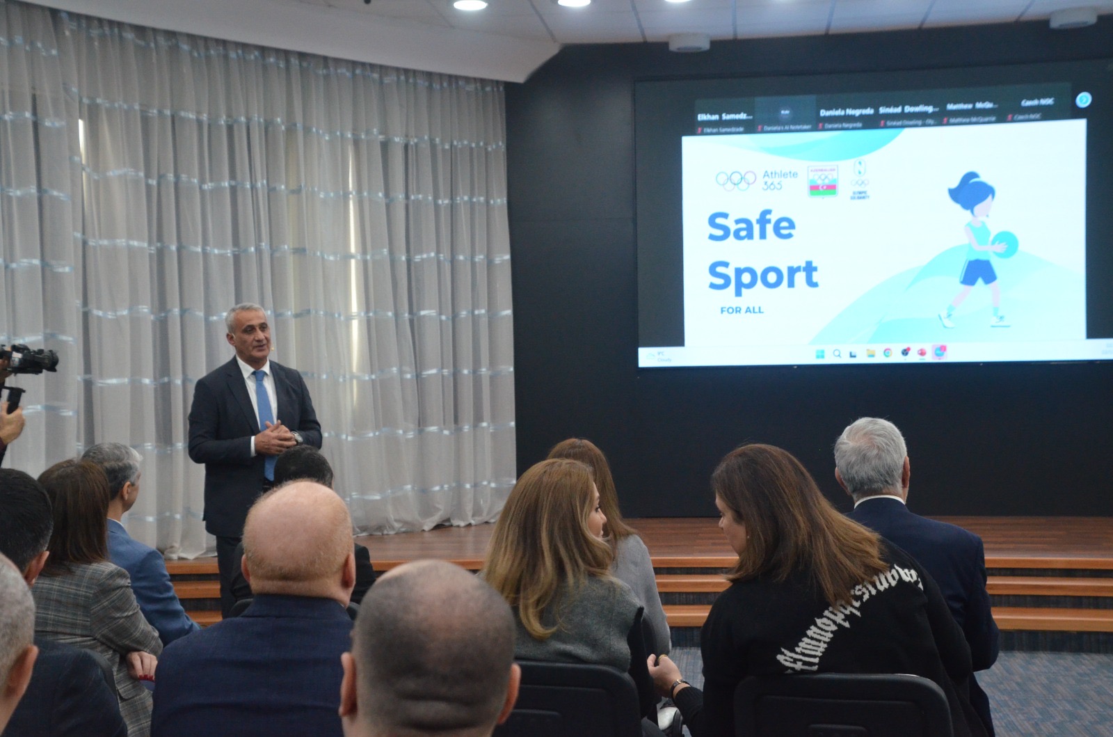 Milli Olimpiya Komitəsinin idman idarəsinin baş məsləhətçisi, Təhlükəsiz idman üzrə Beynəlxalq Olimpiya Komitəsinin setifikatlaşdırılmış mütəxəssisi Vaqif Əliyev Təhlükəsiz idman hamı üçün - siyasət və prosedurlar mövzusunda çıxış edib. Kaliforniya Universitetinin nümayəndəsi Daniela Neqreda Avropa Birliyinin Təhlükəsiz idman üzrə BESST (Building European Safe Sport Together) mövzusunda layihənin mahiyyətindən danışıb.