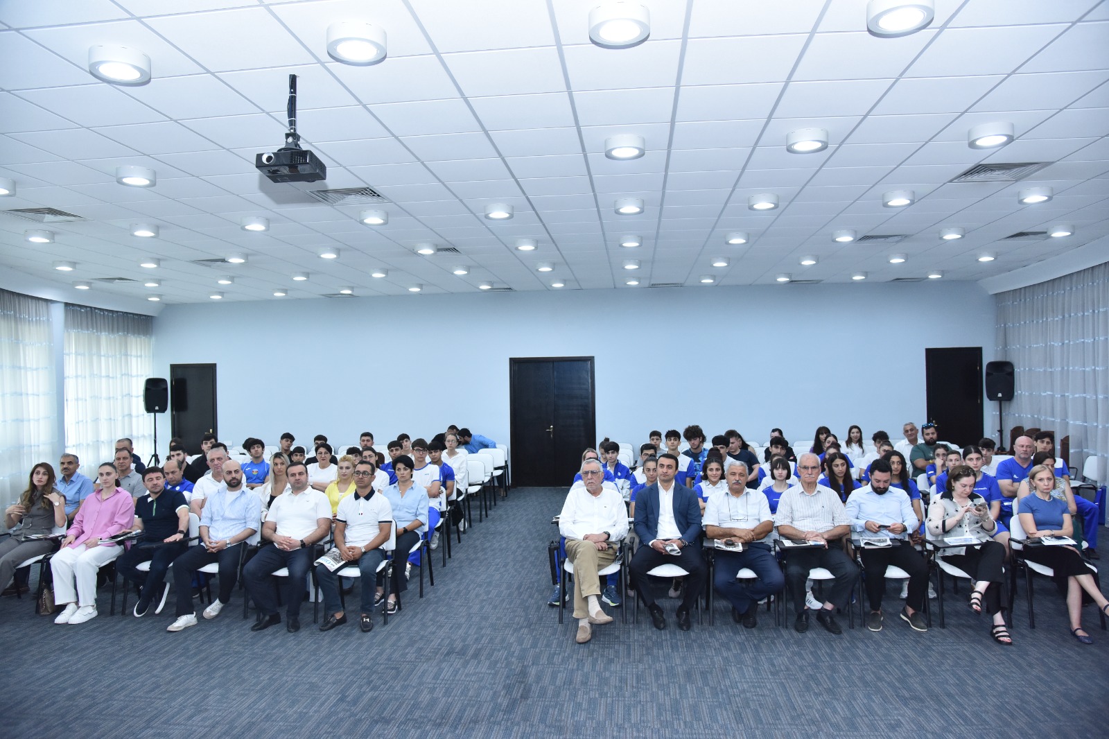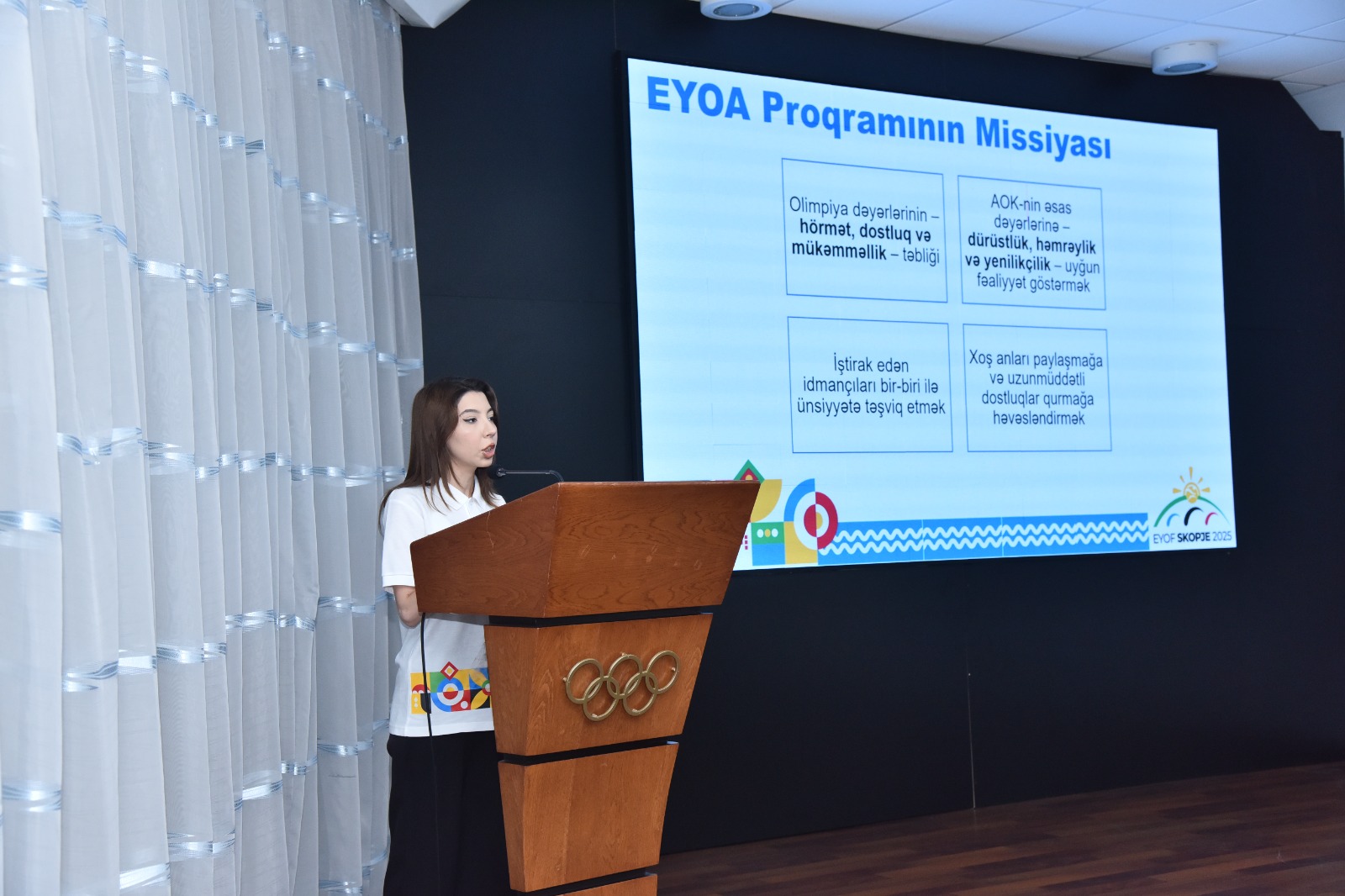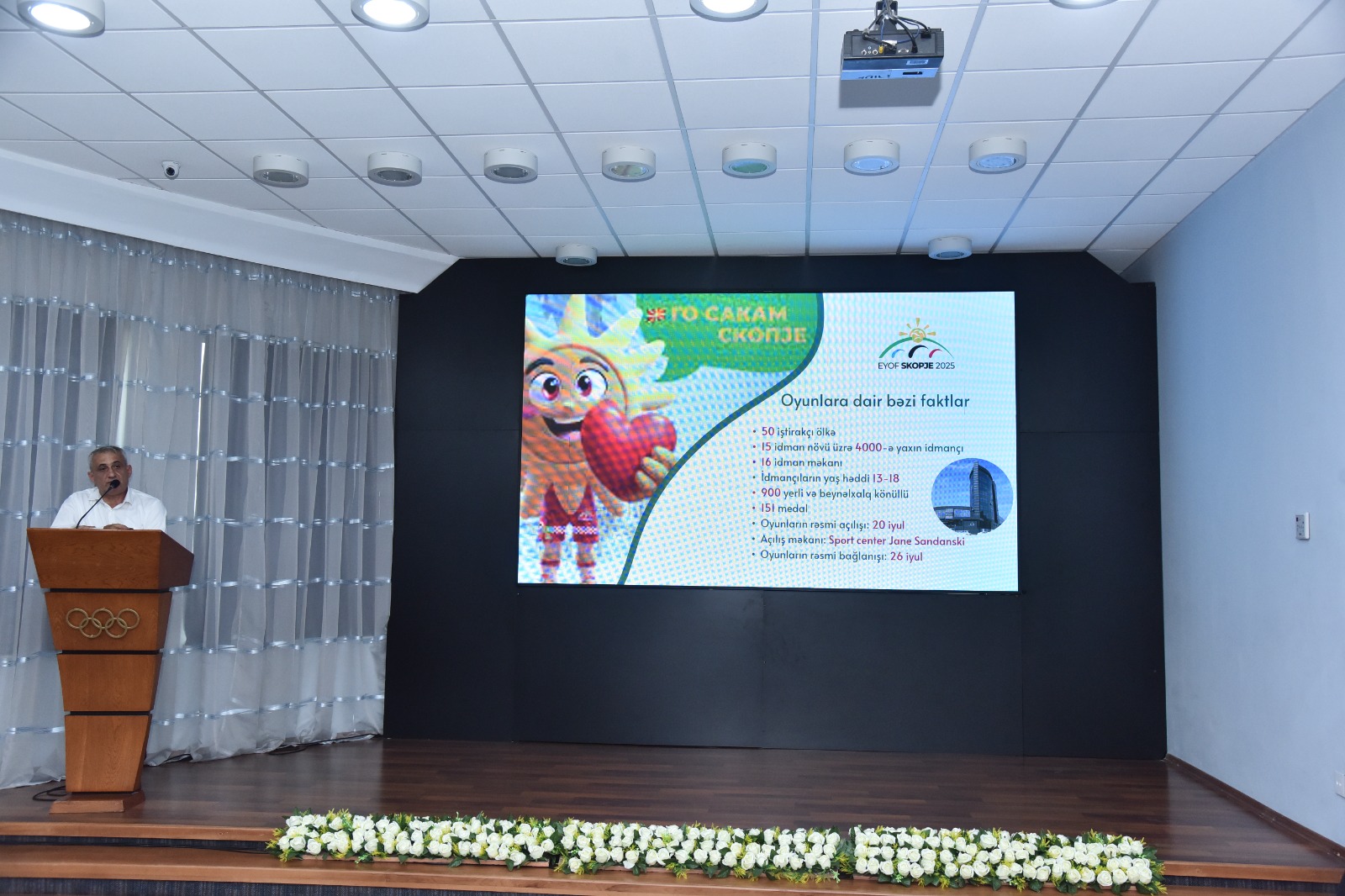 Skopye-2025 Avropa Gənclər Olimpiya Festivalı haqqında video təqdimatdan sonra komandanın missiya rəhbəri Vaqif Əliyev yarışa hazırlıq və “Təhlükəsiz İdman”a dair nümunəvi sənəd haqqında təqdimatla çıxış edib.