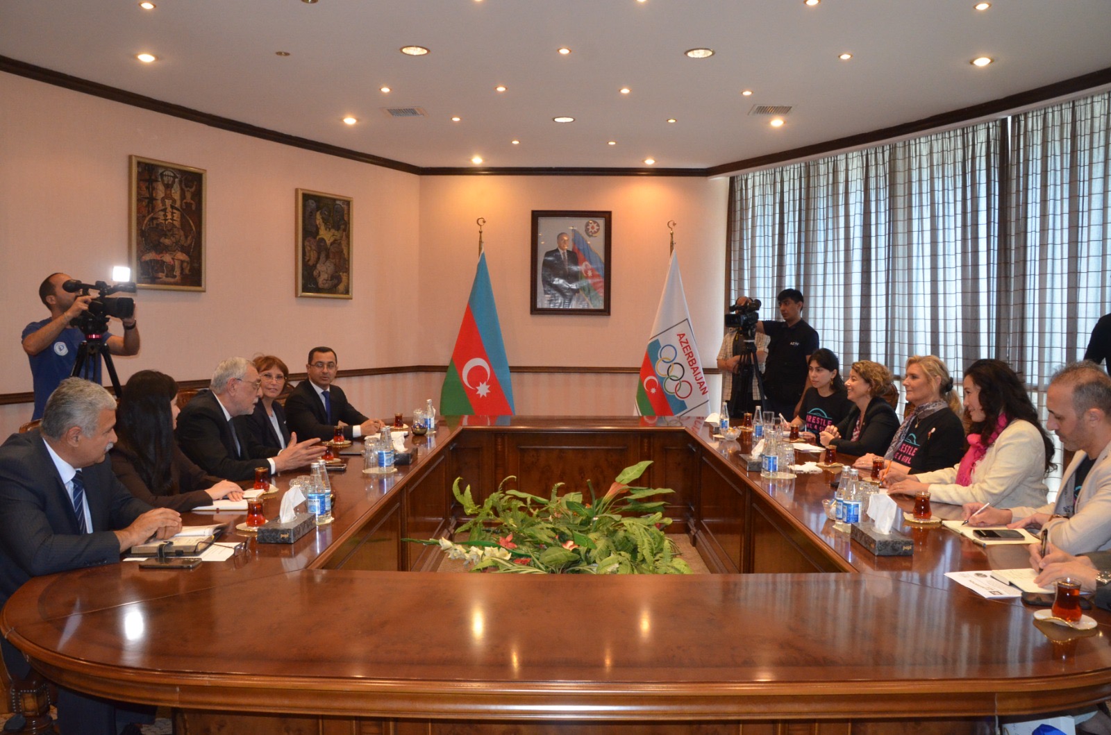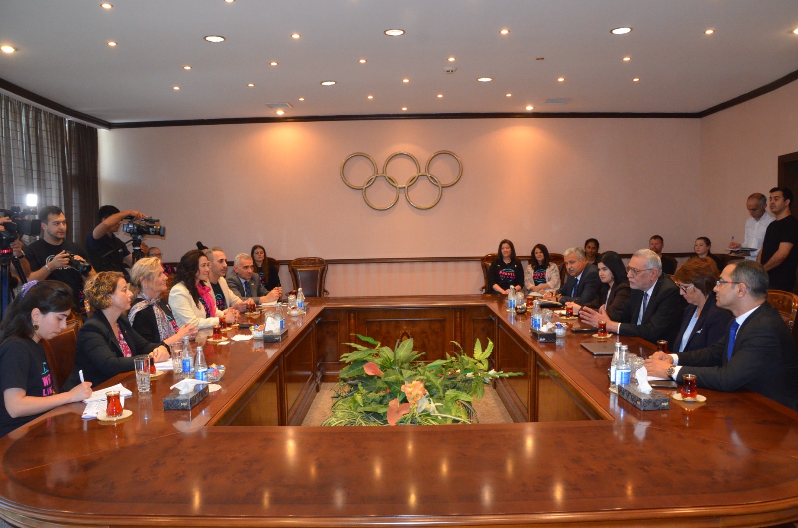 Görüşdə Milli Olimpiya Komitəsi tərəfindən qonaqlara xatirə hədiyyələri təqdim edilib.