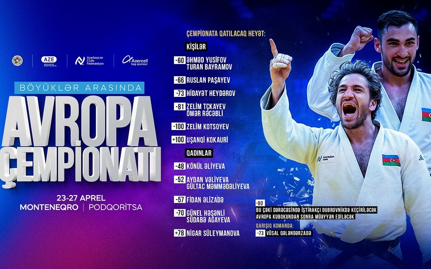 Aprelin 23-27-də Monteneqronun paytaxtı Podqoritsa şəhərində böyüklər arasında cüdo üzrə Avropa çempionatı keçiriləcək. Azərbaycan Cüdo Federasiyasının mətbuat xidmətindən verilən məlumata görə, qitə çempionatının fərdi yarışlarında Azərbaycanı 12 çəki dərəcəsində ümumilikdə 16 cüdoçu (9 kişi, 7 qadın) təmsil edəcək.