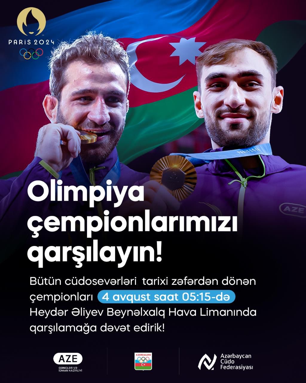 Bütün cüdosevərləri tarixi zəfərdən dönən idmançılarımızı 4 avqust saat 5:15-də Heydər Əliyev Beynəlxalq Hava Limanınında qarşılamağa dəvət edirik.