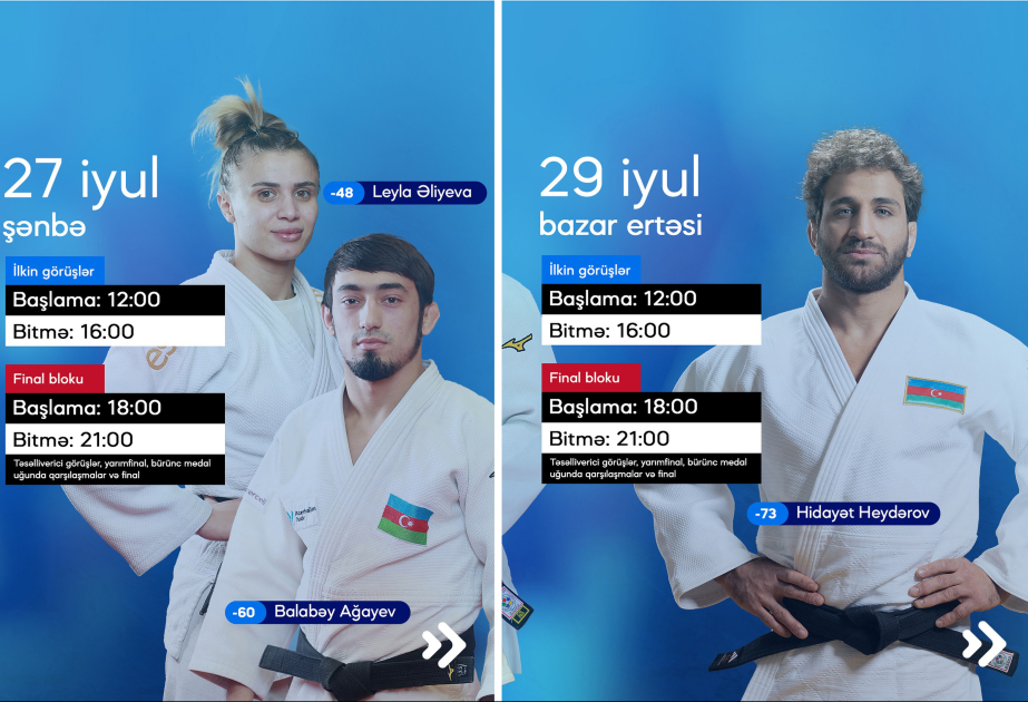 Azərbaycan cüdoçuları mübarizəyə iyulun 27-də qoşulacaqlar. İlk yarış günündə qadınlarda 48, kişilərdə isə 60 kiloqram çəki dərəcələrində qaliblər müəyyənləşəcək.