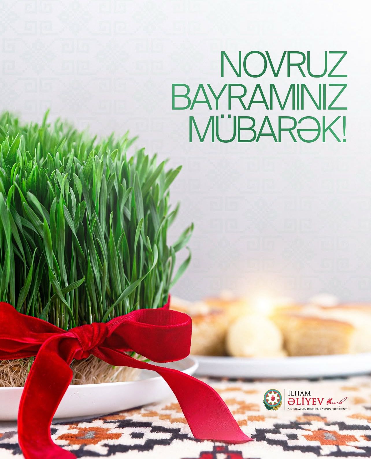 Sizi Novruz bayramı münasibətilə ürəkdən təbrik edir, hər birinizə bahar əhval-ruhiyyəsi, cansağlığı və uğurlar arzulayıram”.