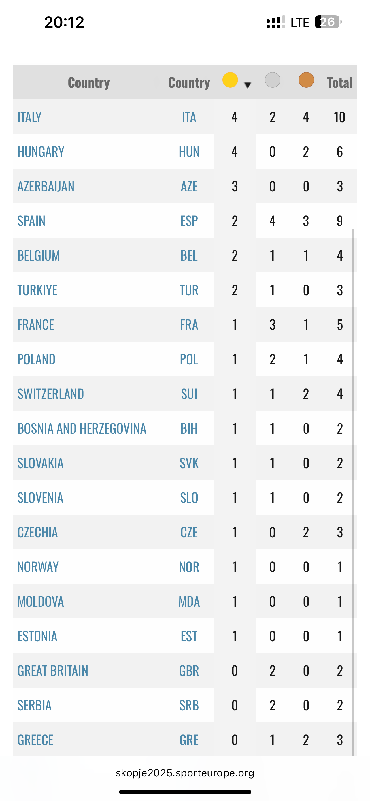 Skopye-2025: İtaliya medal sıralamasına başçılıq edir - Medal siyahısı