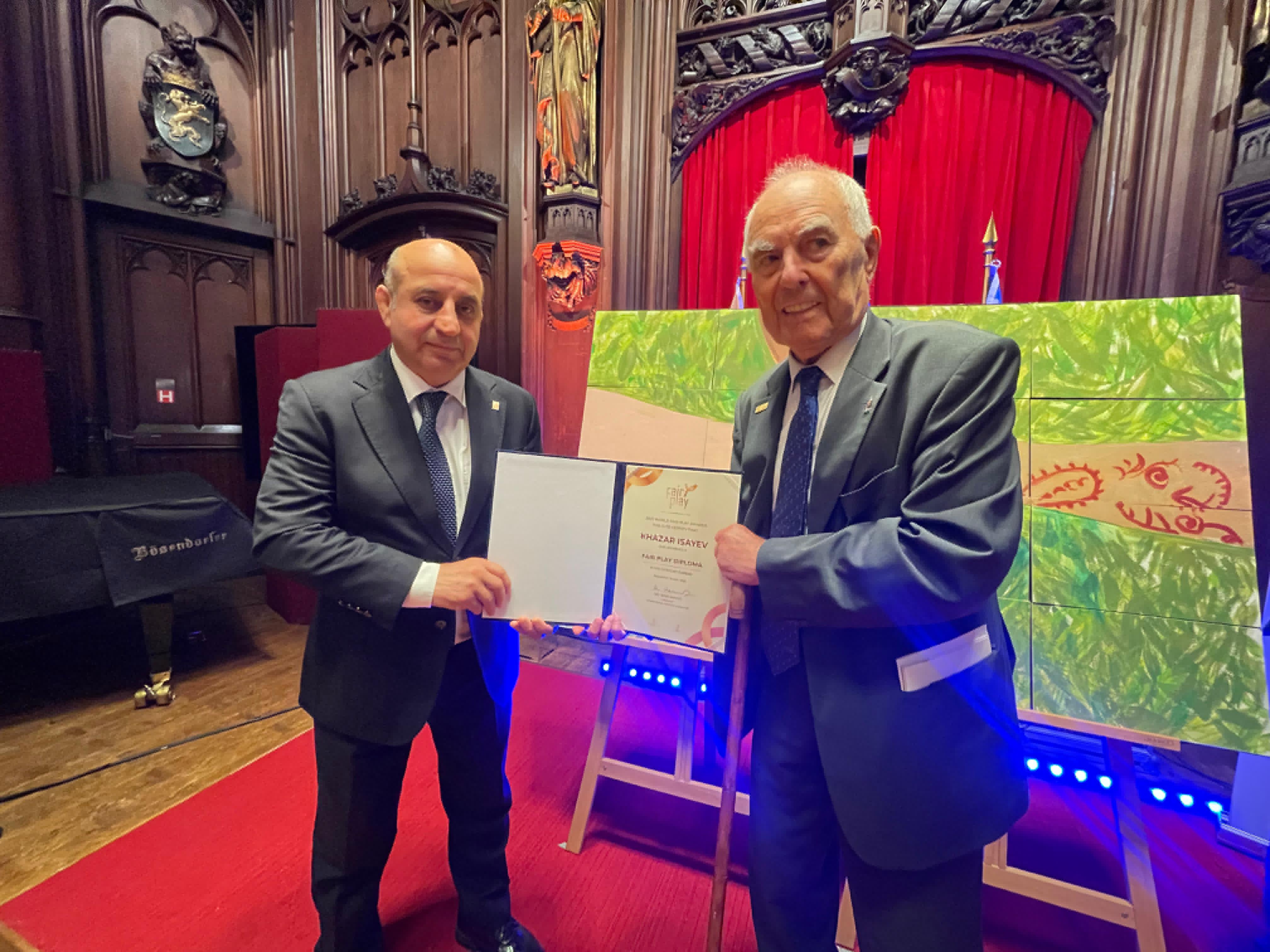 Tədbir çərçivəsində Xəzər İsayev, idmanda ədalətli oyun prinsiplərinin təşviqi sahəsində uzunillik fəaliyyətinə, gənc nəslin bu dəyərlər ruhunda tərbiyəsinə verdiyi töhfələrə, eləcə də beynəlxalq fair play hərəkatında fəal iştirakı və təşəbbüskar mövqeyinə görə Beynəlxalq Ədalətli Oyunlar Komitəsinin (CIFP) fəxri prezidenti, professor Jeno Kamuti tərəfindən “Ədalətli Oyun Karyerası” nominasiyası üzrə diplomla təltif edilib.