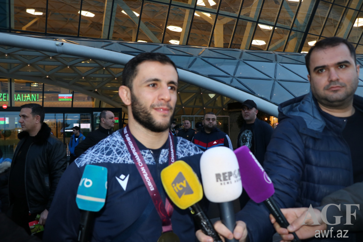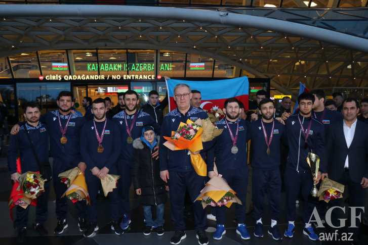 2 qızıl, 1 gümüş və 5 bürünc medalla komanda hesabında Avropa çempionu olan yığma komandanın üzvlərini Heydər Əliyev Beynəlxalq Aeroportunda Güləş Federasiyasının, eləcə də Gənclər və İdman Nazirliyinin rəsmiləri, məşqçilər və idmançılar qarşılayıb.