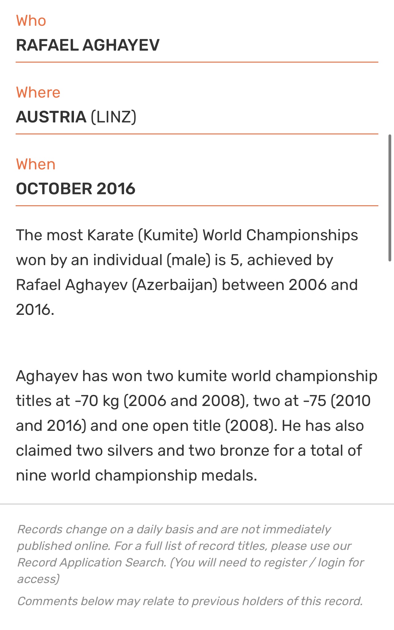 Tanınmış karateçi, karatenin "Qara brilliant"ı Rafael Ağayev fərdi yarışlarda ən çox dünya çempionu olan idmançı kimi Ginnesin Rekordlar kitabına düşüb.