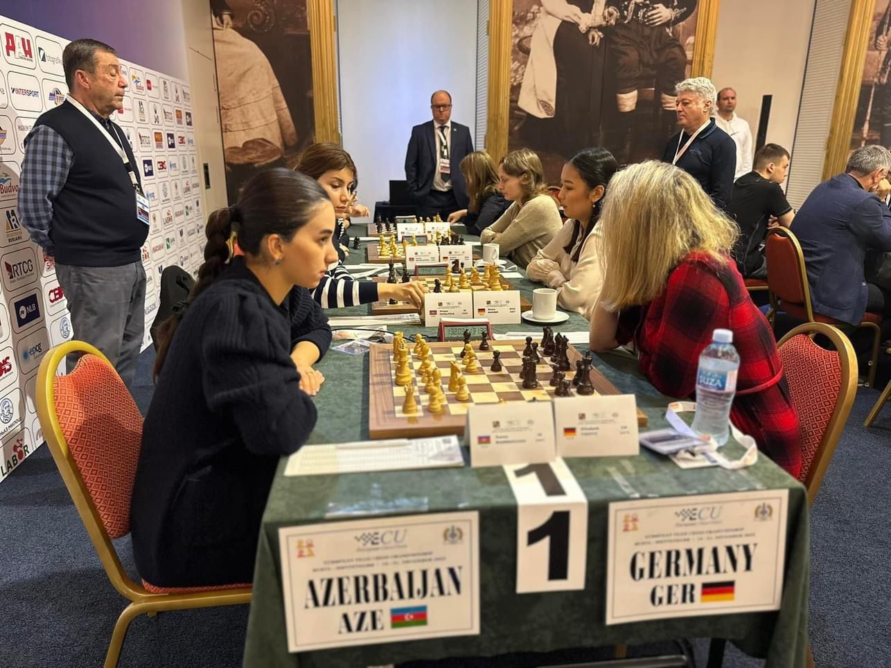 Qadın şahmatçılardan ibarət Azərbaycan millisi Almaniya ilə üz-üzə gəlib. Ülviyyə Fətəliyeva, Gövhər Beydullayeva və Gülnar Məmmədova turu heç-heçə ilə başa vurub. Birinci lövhədə Günay Məmmədzadənin Elizabet Petsi məğlub etməsi Azərbaycan komandasına 2,5-1,5 hesabı ilə qələbə qazandırıb.