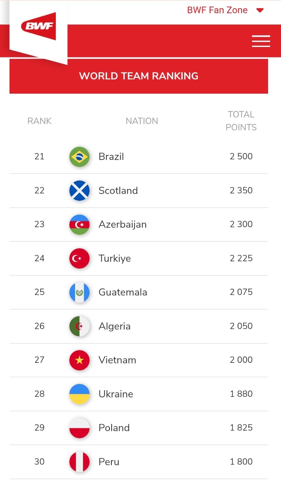 Dünya Badminton Federasiyası (BWF) milli komandaların yeni reytinq siyahısını açıqlayıb.
