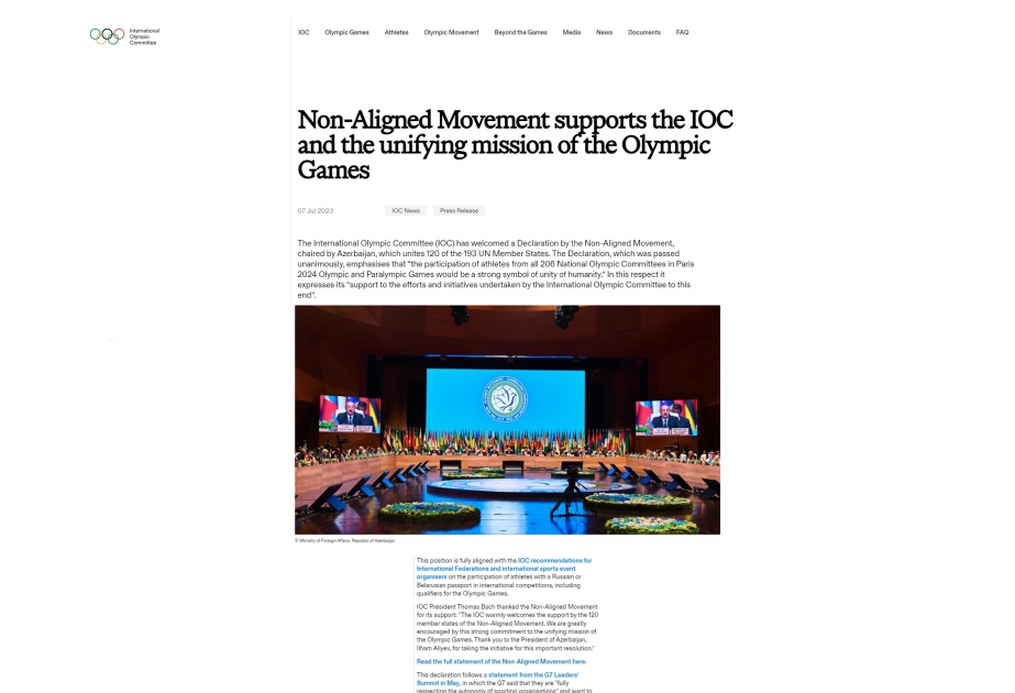 Beynəlxalq Olimpiya Komitəsi Qoşulmama Hərəkatının Bakı Bəyannaməsini alqışlayıb