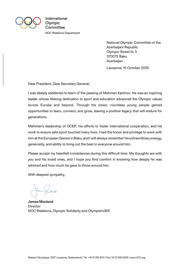 Beynəlxalq Olimpiya Komitəsindən (BOK) Milli Olimpiya Komitəsinin beynəlxalq proqramlar idarəsinin müdiri Mehman Kərimovun vəfatı ilə bağlı dərin hüznlə başsağlığı məktubu göndərilib.