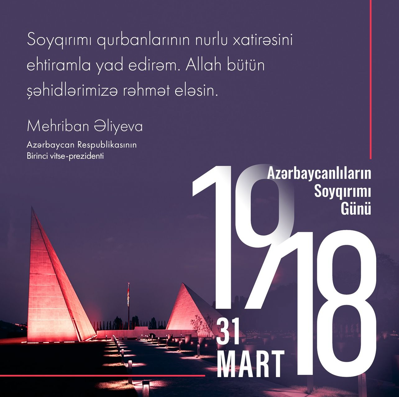 Azərbaycan Respublikasının Birinci vitse-prezidenti Mehriban Əliyeva sosial şəbəkə hesablarında 31 Mart – Azərbaycanlıların Soyqırımı Günü ilə bağlı paylaşım edib.