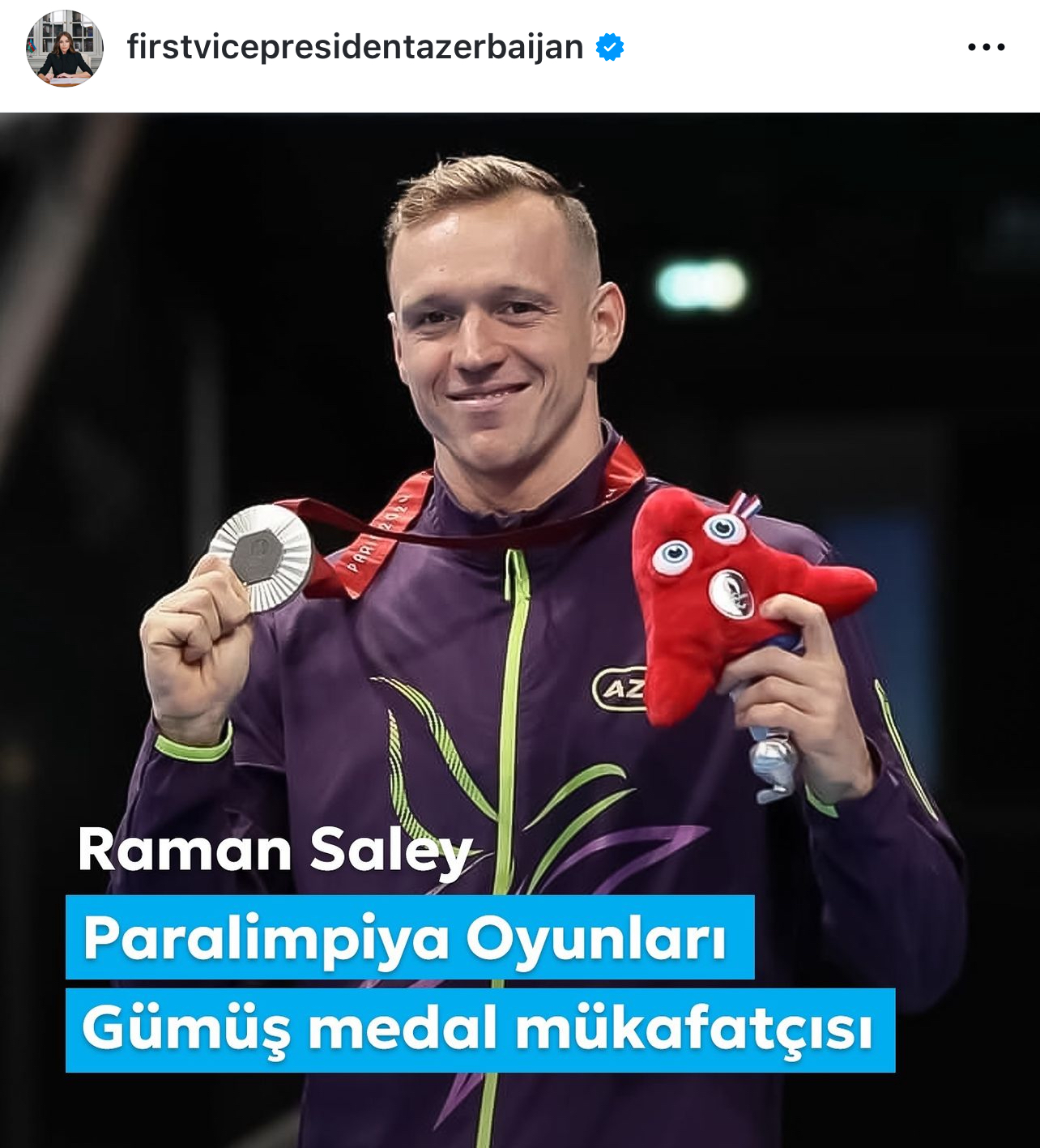 “Gümüş medal! Paraüzgüçü Raman Saley Azərbaycanı “Paris-2024” Yay Paralimpiya Oyunlarında layiqincə təmsil etdi! İdmançımızı təbrik edir, ona güc, enerji və yeni qələbələr arzulayıram!”.