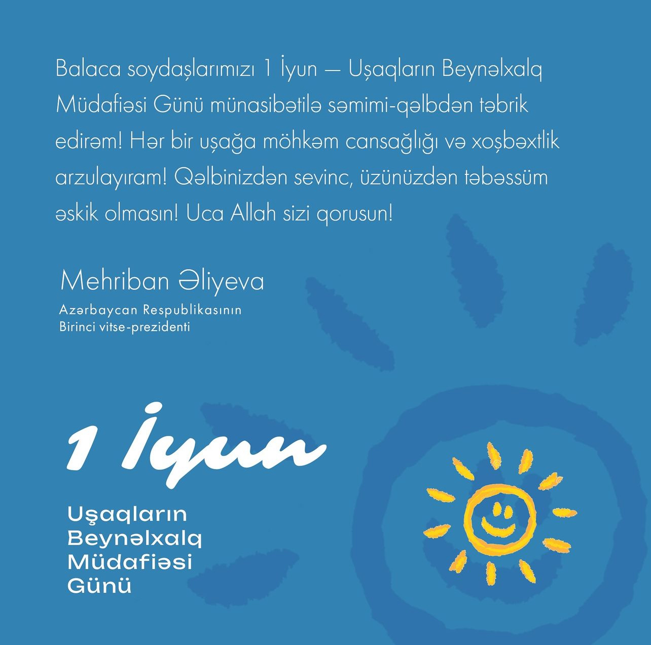 Azərbaycan Respublikasının Birinci vitse-prezidenti Mehriban Əliyeva 1 İyun – Uşaqların Beynəlxalq Müdafiəsi Günü münasibətilə rəsmi sosial media hesablarında paylaşım edib.
