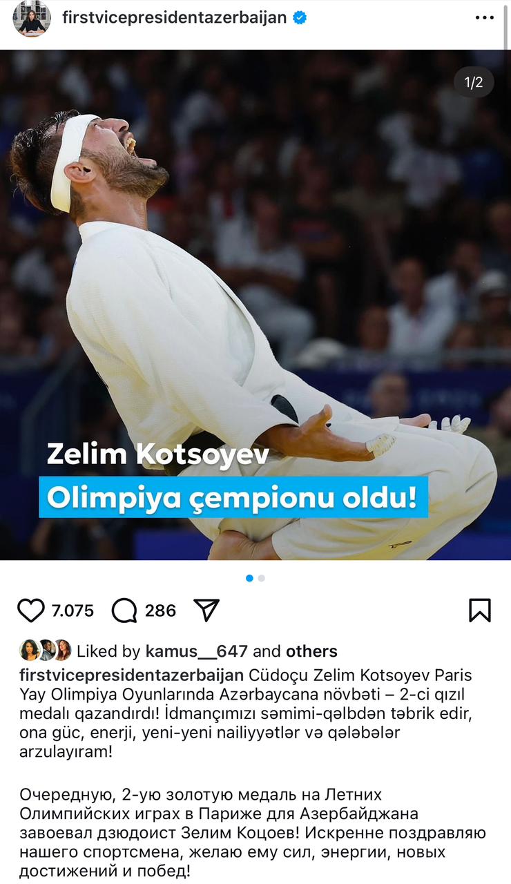Azərbaycanın Birinci vitse-prezidenti Mehriban Əliyeva rəsmi sosial media hesablarında Zelim Kotsoyevin Olimpiya çempionu olması ilə bağlı paylaşım edib.
