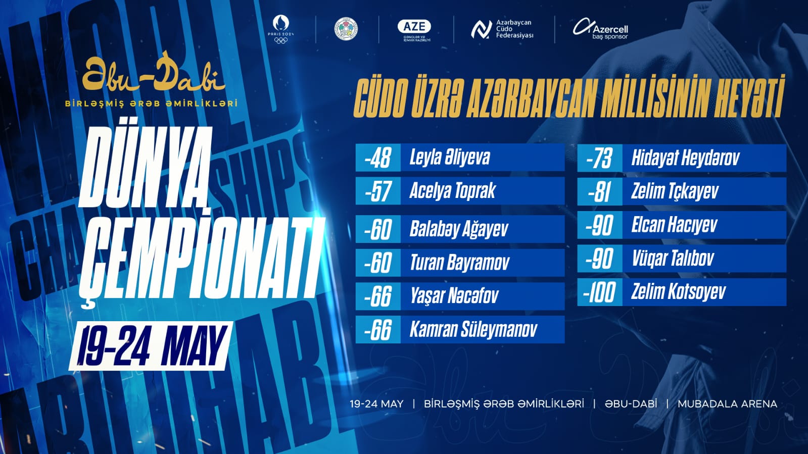Birləşmiş Ərəb Əmirlikləri 19-24 mayda cüdo üzrə dünya çempionatına ev sahibliyi edəcək. 100-dən çox ölkədən 700-ə yaxın idmançının iştirak edəcəyi çempionatda Azərbaycan cüdo üzrə milli yığma komandası 8 çəki dərəsində 9 kişi və 2 qadın ilə təmsil olunacaq.