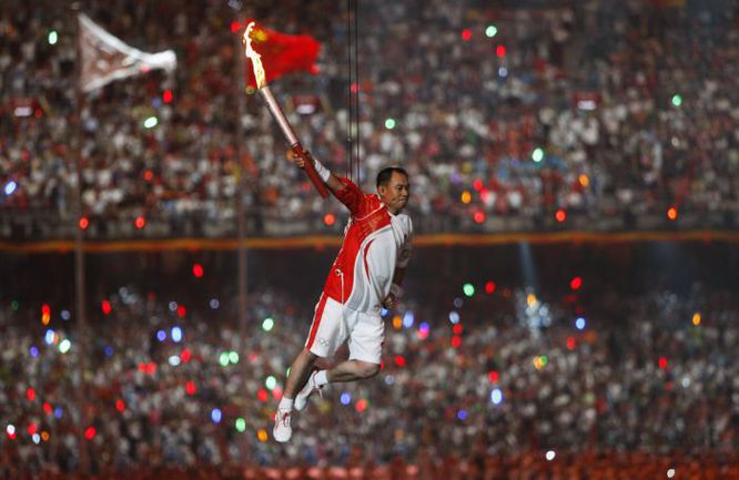 “Bir dünya - bir arzu” devizi altında keçən 2008-ci il Oyunlarının açılış mərasimində ən yaddaqalan məqamlardan biri Olimpiya məşəlinin yandırılması olub. Bu şərəfli vəzifəni Olimpiya çempionu, Los-Ancelesdə keçirilmiş XXIII Yay Olimpiya Oyunlarında üç qızıl, iki gümüş və bir bürünc medal qazanaraq, Dünya İdman Jurnalistləri Assosiasiyasının versiyasına görə, XX yüzilliyin 25 ən böyük atletindən biri hesab edilmiş məşhur Çin gimnastı Li Nin yerinə yetirib.