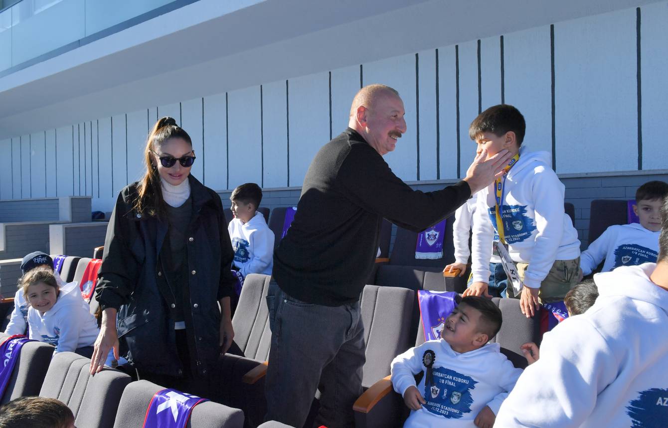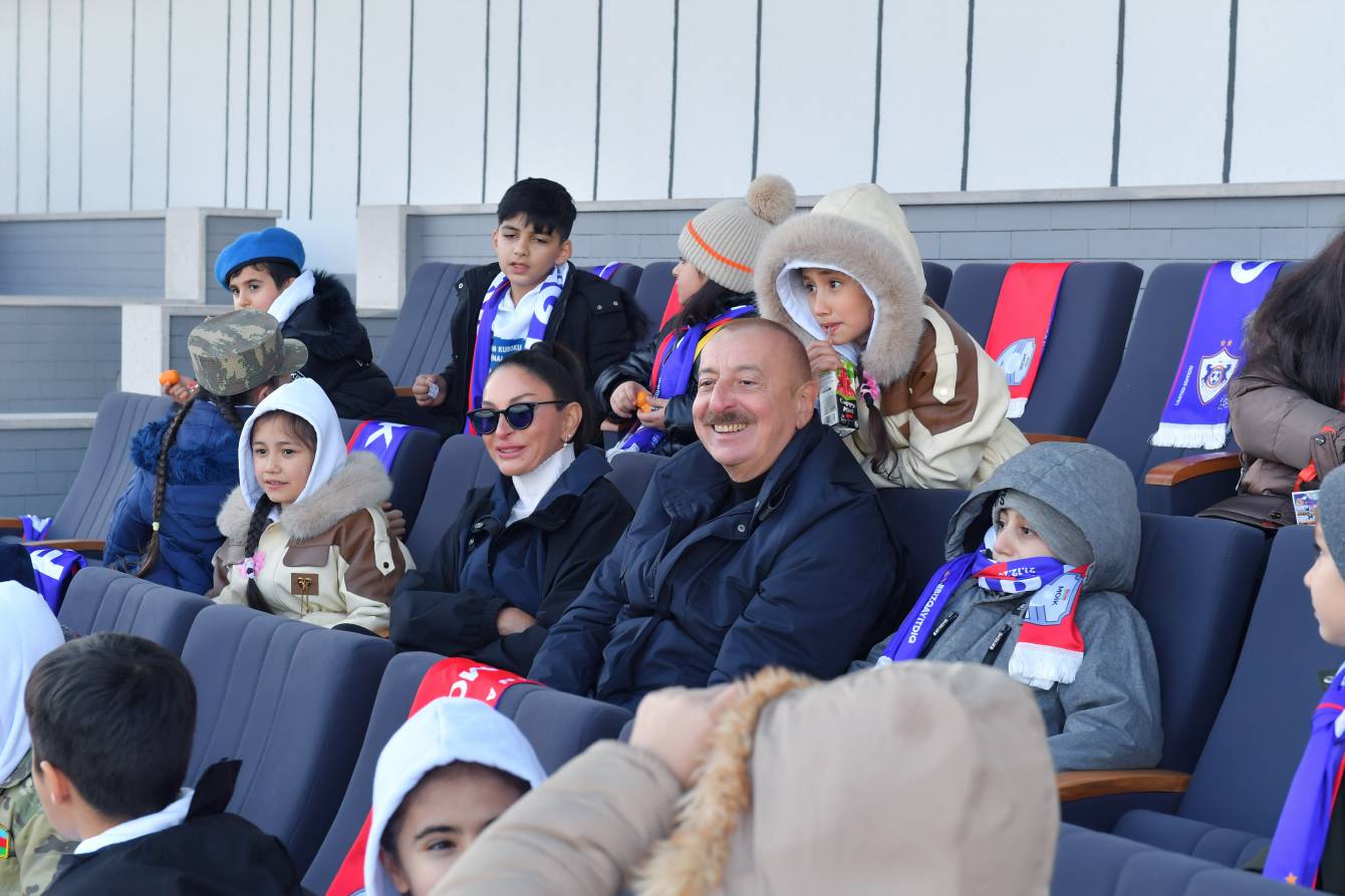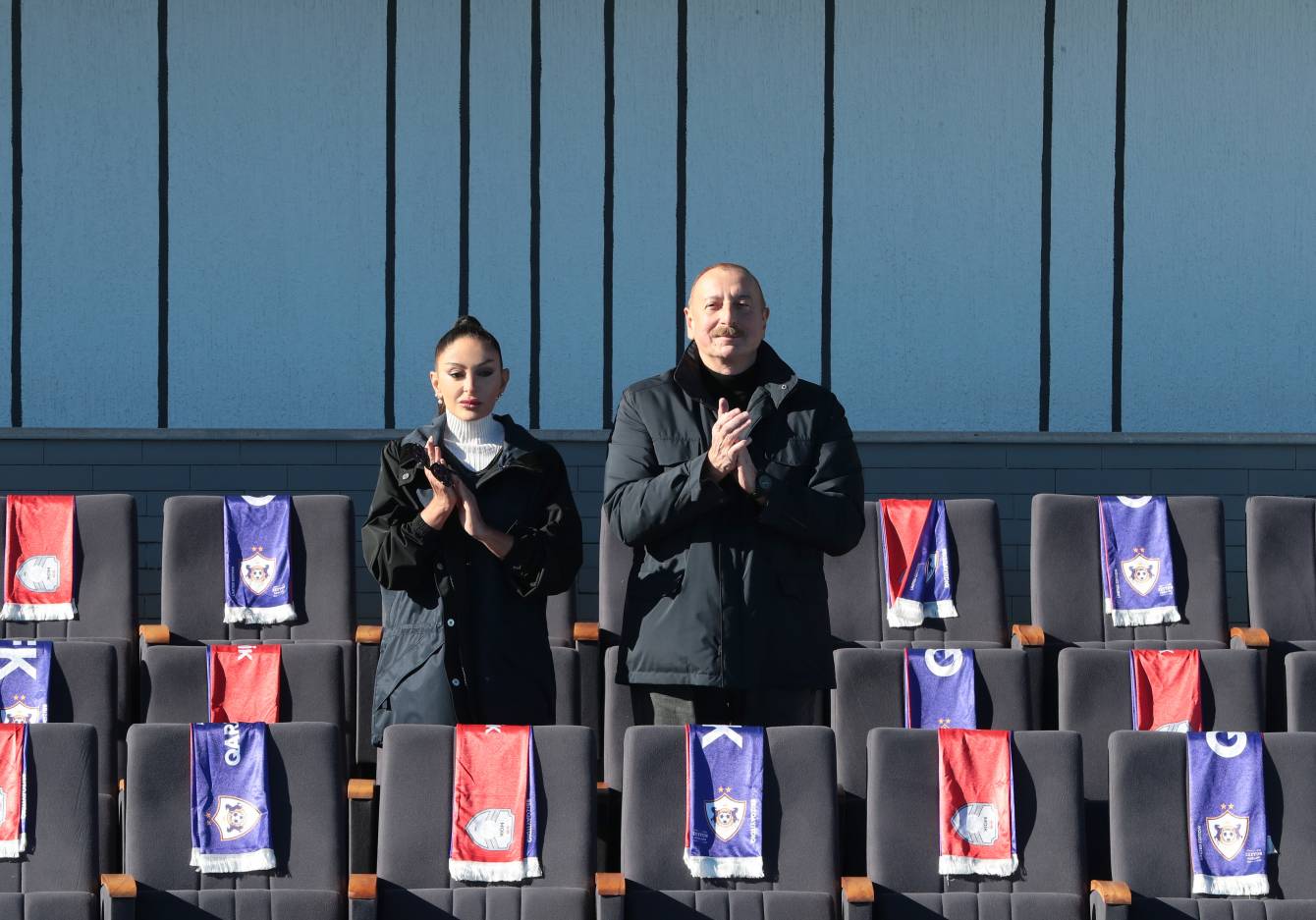Azərbaycan Respublikasının Prezidenti İlham Əliyev və birinci xanım Mehriban Əliyeva oyuna baxmaq üçün stadiona gəliblər.