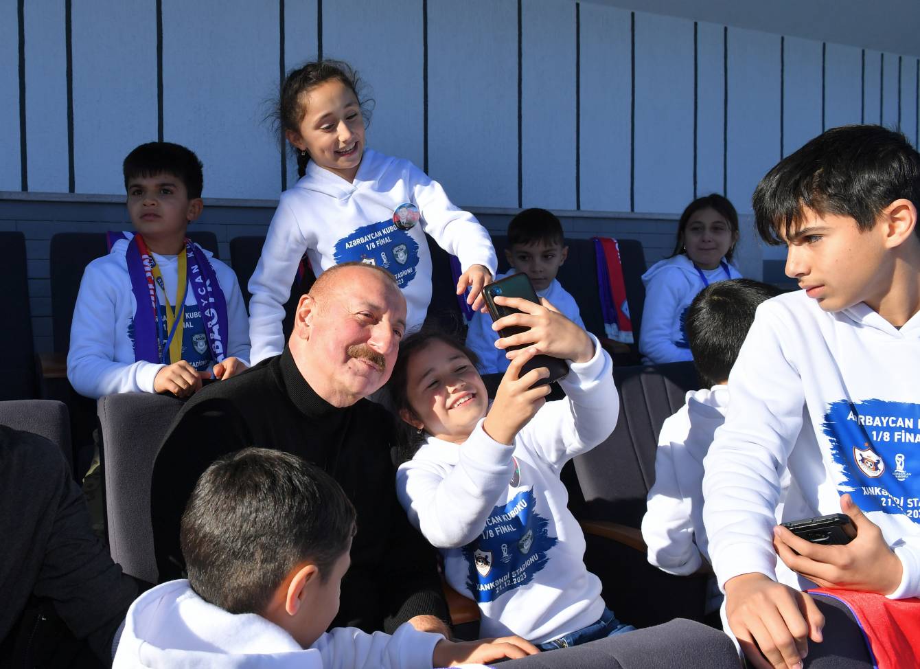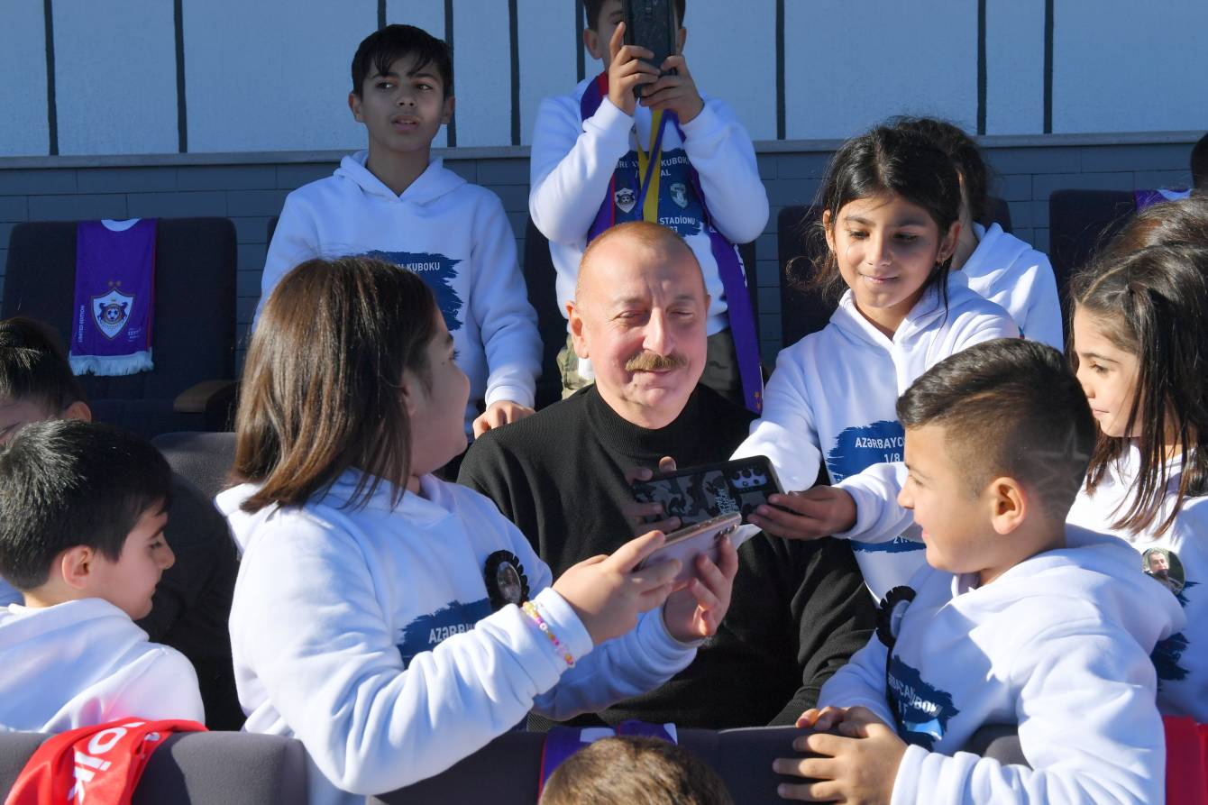 Stadiona daxil olan dövlətimizin başçısı futbolçularla və oyunu idarə edən hakimlərlə görüşdü, onlarla xatirə şəkli çəkdirdi.