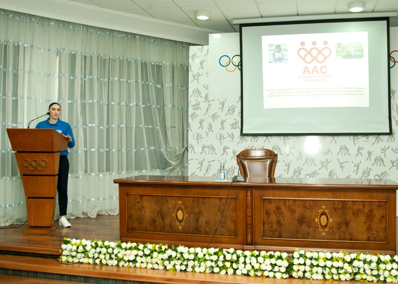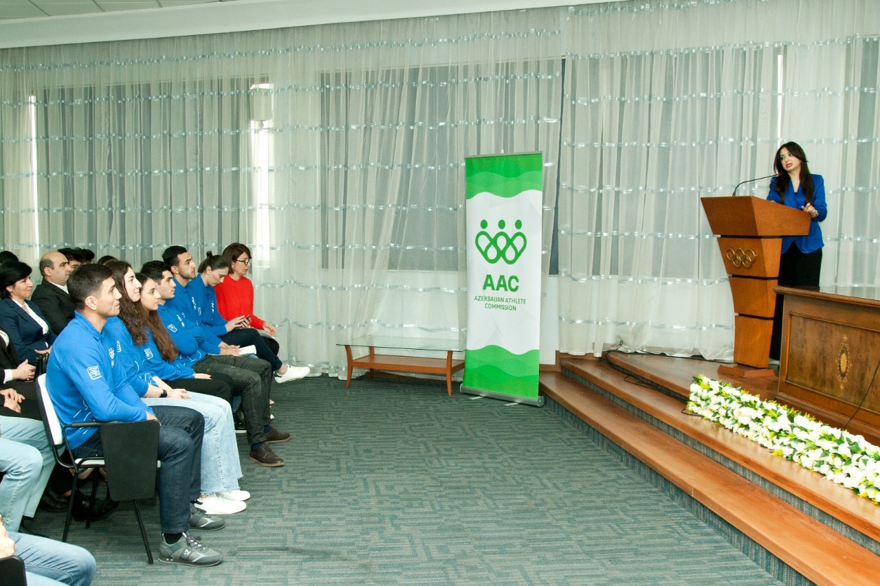 Milli Olimpiya Komitəsinin inzibati binasında olimpiyaçılar, Olimpiya idman növləri federasiyalarının üzvləri, media nümayəndələrinin iştirakı ilə MOK-un Atletlər Komisiyasının tədbiri baş tutdu. Komissiyanın sədri, Olimpiya medalçısı, cüdoçu Rüstəm Orucov çıxış edərək bildirdi ki, Atletlər Komissiyasının əsas vəzifəsi əlaqələndirici rolu oynamaqdır. Onun sözlərinə görə, Atletlər Komissiyası Avropa Olimpiya Komitəsi (AOK), eləcə də digər ölkələrin Milli Olimpiya Komitələrinin Atletlər komissiyaları, ölkəmizin milli idman federasiyaları və Azərbaycan Milli Antidopinq Agentliyi (AMADA) ilə qarşılıqlı əlaqə əsasında müxtəlif layihələr reallaşdırmaqda maraqlıdır. Bu layihələr idmançıların peşəkar fəaliyyətlərini davam etdimələri üçün əhəmiyyətli ola bilər. “Biz komissiya olaraq idmançılarımızın maraq dairəsində olan məsələlərə dair müzakirə aparıb, istiqamətlər müyyənləşdirməyə hazırıq. Onların idmandan sonrakı karyeralarının inkişafına imkan yaradan layihələr reallaşdırmağı bu sahədə dünya təcrübəsindəki yeniliklər haqda məlumatlandırmağı planlaşdırırq.” İslam Oyunlarının qızıl medalçısı, Atletlər Komissiyasının üzvü Fəridə Əzizova isə komissiyanının loqosunu təqdim edib. O, Azərbaycan Milli Olimpiya Komitəsinin Atletlər Komissiyasının loqosunun idmançılar arasında həmrəyliyi, dostluğu, ümumbəşəri dəyərlərə sadiqliyi və Olimpiya ruhunu ehtiva etdiyini bildirib. Fəridə Əzizova qeyd edib ki, Atletlər Komissiyasının loqosunun bir rəngi olmayacaq. Olimpiya halqalarının bütün rənglərindən istifadə etməklə MOK-un Atletlər Komissiyası fərqli istiqamətdəki tədbirlərdə loqonun həmin tədbirə uyğun rəngi ilə təmsil olunmağa üstünlük verib. Onun sözlərinə görə, idman sahəsində ən çox istifadə olunan mavi rəng loqonun əsas rəngindir. Bu rəng birlik və bərabərliyi, sülhü və gənclik enerjisini özündə cəmləşdirir. Azərbaycan Atletlər Komissiyası da bu keyfiyyətləri idmançılara təbliğ və təşviq edir. İnsanda canlılıq və dinamiklik yaradan qırmızı rəng xoşbəxtliyi təmsil edir. İdmanın özündə birləşdirdiyi sevgi, qalibiyyət və əzmin rəngi olan qırmızı rəngdə loqo ilə komissiya beynəlxalq tədbirlərdə təmsil olunacaq. Sağlamlığı, təbiəti təmsil edən yaşıl rəngli loqo isə Atletlər Komissiyasının məhz bu mövzulara həsr olunan tədbirlərində istifadə ediləcək. Azərbaycan Atletlər Komissiyasının loqosunda yer alan sarı rəng isə qalibiyyətin xoşbəxtliyini və səbrin nəticəsini tərənnüm edir. Gələcəyimizi olan uşaqlarla bağlı tədbirlər loqonun sarı rənginin altında reallaşacaq. Son olaraq Fəridə Əzizova bildirib ki, komissiya istifadə etdiyi qara rənglə idmançıların əzmini, gücünü və davamlı inkişafa meyilli olduğunun mesajını vermək istəyir. AMADA-nın təhsil şöbəsiin müdiri Lalə Hacıyeva öz çıxışında atletlərin üzləşdiyi məkan məlumatı probleminə toxunub. Gənc idmançıların anti dopinq qaydaları ilə bağlı məlumatlılığının artmasının vacibliyini vurğulayan AMADA rəsmisi məkan məlumatı ilə əlaqəli xüsusi qeydləri tədbir iştirakçılarının diqqətinə çatdırdı. Atletlər Komissiyasının üzvü Nazim Babayev Beynəlxalq Olimpiya Komitəsinin atletlər üçün nəzərdə tutduğu”Athlete 365” beynəlxalq platforması haqda təqdimatla çıxış etdi. O bildirdi ki, artıq bütün dünyada idmançılar bu platformadan yararlanaraq peşəkar fəaliyyətlərinə və ümumillikdə həyatlarına yeniliklər qata bilirlər. Sonda Olimpiya Çempionu Fərid Mansurov idmançı karyerasını davam etdiməsi ilə bağlı təcrübəsini gənc idmançılarla bölüşdü. Onların suallarını cavablandırdı.