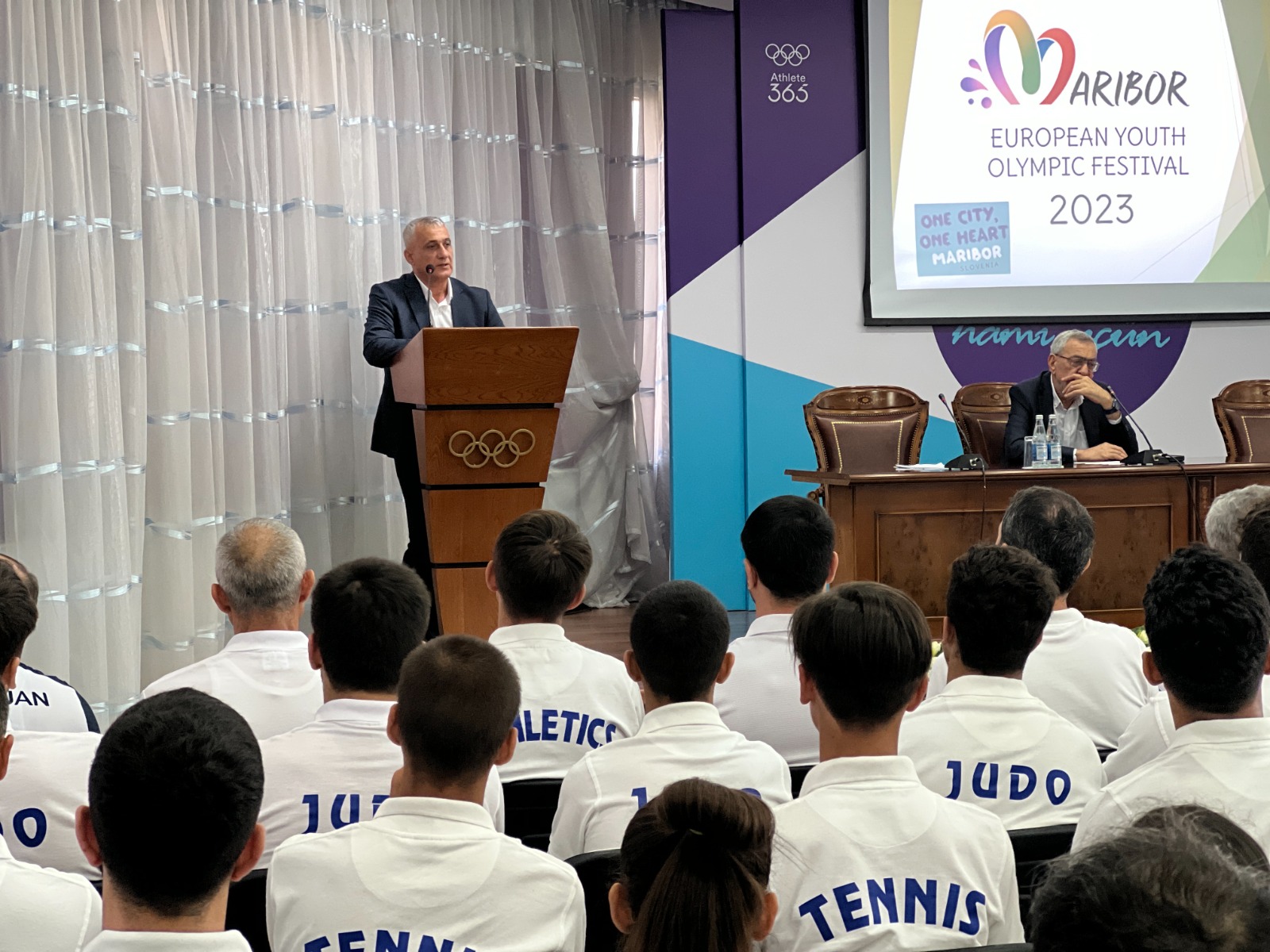 Avropa Yeniyetmələrinin XVII Yay Olimpiya Festivalında Azərbaycanı təmsil edəcək idmançılara uğurlar arzulayan Milli Olimpiya Komitısinin vitse-prezidenti Çingiz Hüseynzadə yarışların əhəmiyyətini vurğulayıb. “Təcrübə onu göstərir ki, Avropa Yeniyetmələrinin Yay Olimpiya Festivallarında hər zaman Azərbaycan komandası fərqlənib”. Avropa Yeniyetmələrinin XVII Yay Olimpiya Festivalının missiya rəhbəri Vaqif Əliyev Sloveniyanın Maribor bölgəsində keçiriləcək festival haqda tədbir iştirakçılarına məlumat verib. Festivalda 48 iştirakçı ölkə, 11 idman növü üzrə 3600-a yaxın 14-18 yaş həddində olan yeniyetmə idmançılarla iştirak edəcək. Avropa Yeniyetmələrinin XVII Yay Olimpiya Festivalının rəsmi açılışı 23 iyul, bağlanış mərasimi isə 29 iyul tarixlərinə təsadüf edir. Azərbaycan idmançılarının atletika, tennis, üzgüçülük, velosiped, MTB, cüdo və gimnastika idman növlərində təmsil olunacaqlarını bildirən missiya rəhbəri Olimpiya kəndinə dair məlumatlarla yanaşı, tibbi xidmət, nəqliyyat və başqa texniki məsələlər haqqında tədbir iştirakçılarına məlumat verib. Daha sonra MOK-un Beynəlxalq Proqramlar idarəsinin əməkdaşı Ceyhun Rəhmanov Avropa Yeniyetmələrinin XVII Yay Olimpiya Festivalında OCEP məktəblilərinin iştirakından danışıb. Qeyd olunub ki, OCEP layihəsi çərçivəsində iştirakçılar üçün qurulacaq pavilyonda ölkəmizi Zaur Məmmədov adına 171 nömrəli tam orta məktəbin şagirdləri təmsil edəcək. AMADA-nın Təhsil proqramları üzrə meneceri Qüdrət Səfərov isə yeniyetmə idmançılara antidopinq istiqamətində mövcud qaydalardan həmçinin onların hüquq və vəzifələrindən bəhs edib. Sonda xatirə şəkli çəkdirilib.