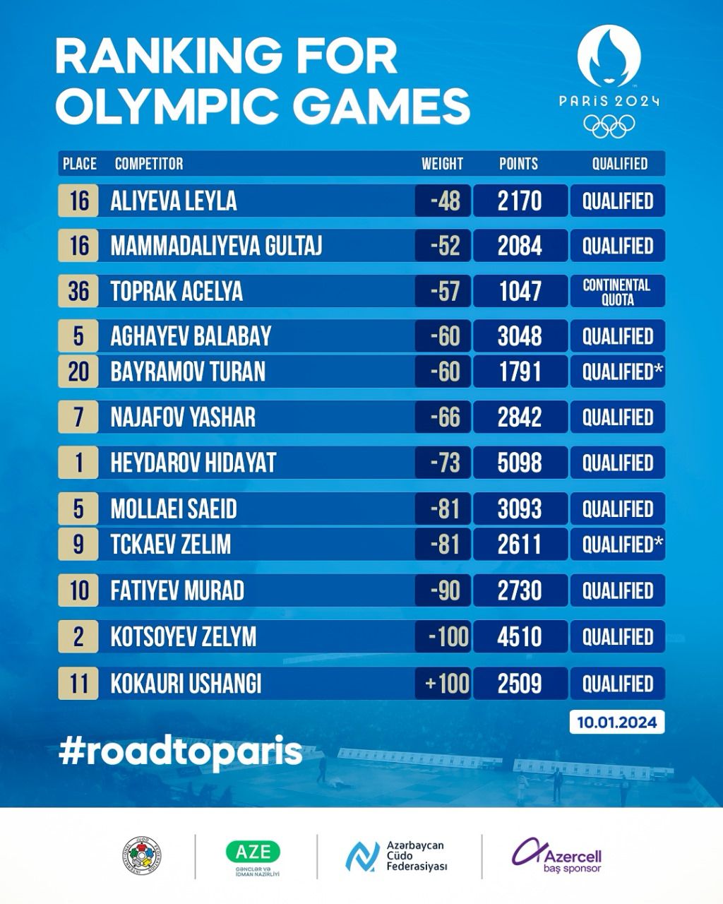 Qeyd edək ki, 12 idmançıdan 11-nin hazırkı mövqeyi “Paris-2024” Yay Olimpiya Oyunlarına lisenziya imkanı verir. Acelya Toprak isə kontinental kvota əsasında Olimpiadada iştirak hüququ qazana bilər.