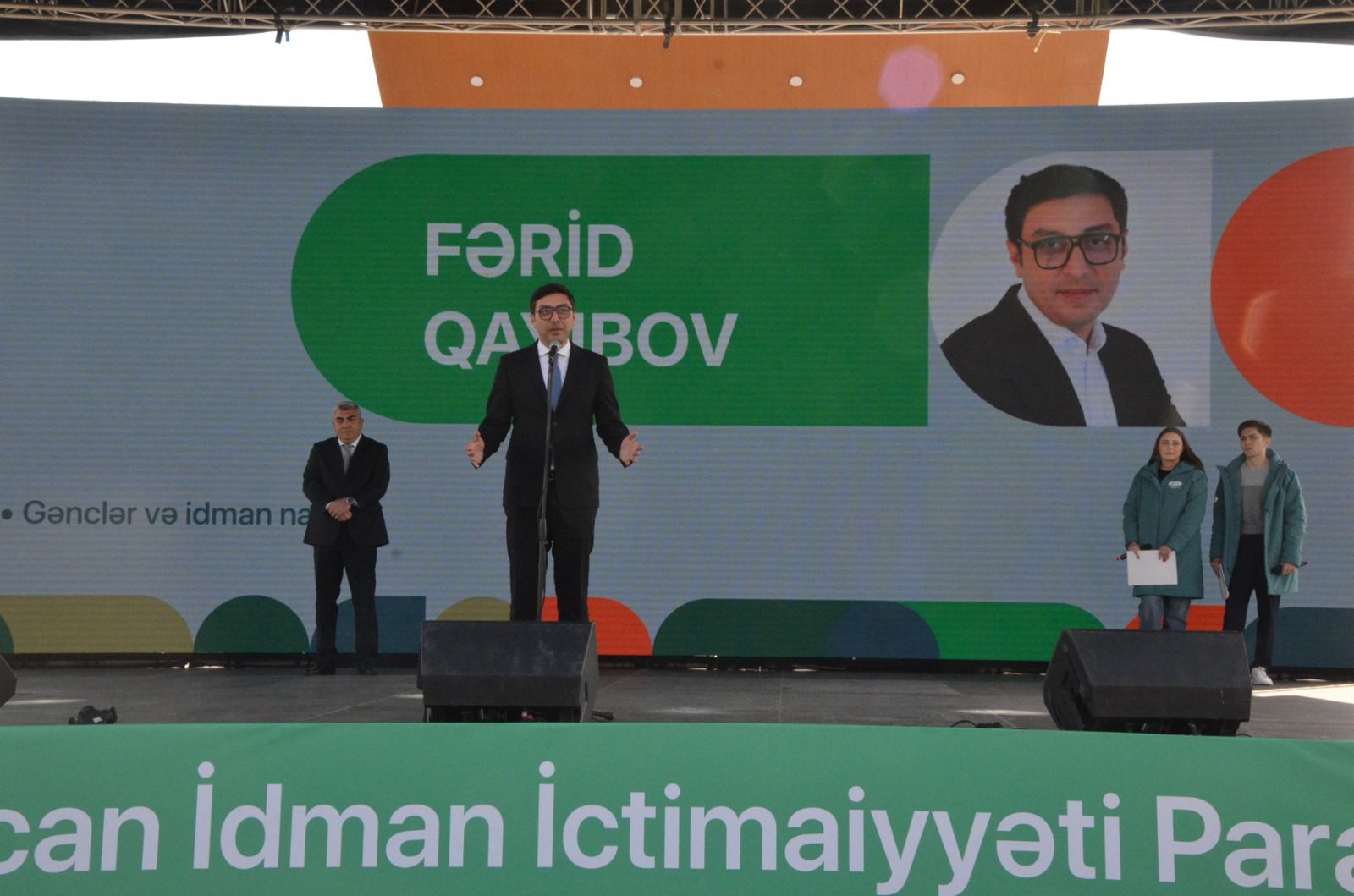 Ardınca Azərbaycan İdman İctimaiyyəti Paradı olub. Ekranda ölkənin bir çox rayonlarında qeyd olunan paradlarlardan monitorlar vasitəsilə kadrlar nümayiş edilib.