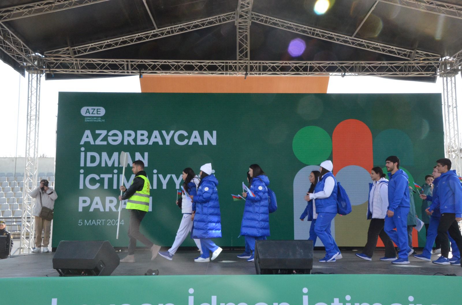 Paraddan ilk olaraq Olimpiya çempionları və mükafatçıları tribuna önündən keçiblər. Sonra idman veteranları səhnəyə yaxınlaşıblar. Tədbir müxtəlif federasiya və idman qurumlarının paradı ilə davam edib.
