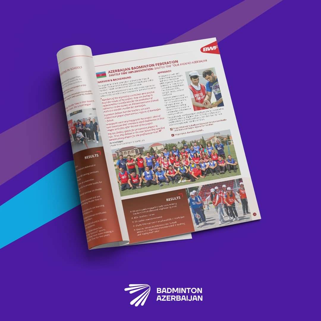 Dünya Badminton Federasiyası tərəfindən “Shuttle Time Best Practice” adlı məlumat kitabçası hazırlanıb. Kitabçada badmintonun təbliğatını məqsədilə icra olunan “Shuttle Time” proqramı çərçivəsində həyata keçirilən ən yaxşı layihələr haqqında məlumat verilib. Sevindirici haldır ki, ən yaxşı təcrübələr sırasında Azərbaycan Badminton Federasiyası tərəfindən həyata keçirilən “Shuttle Time Azerbaijan” layihəsi də yer alıb. Sözügedən kitabça onlayn daxili kommunikasiya sistemi vasitəsilə Dünya Badminton Federasiyasının üzvü olan 140 ölkəyə göndərilib, eləcə də proqramın rəsmi səhifəsində yerləşdirilib.