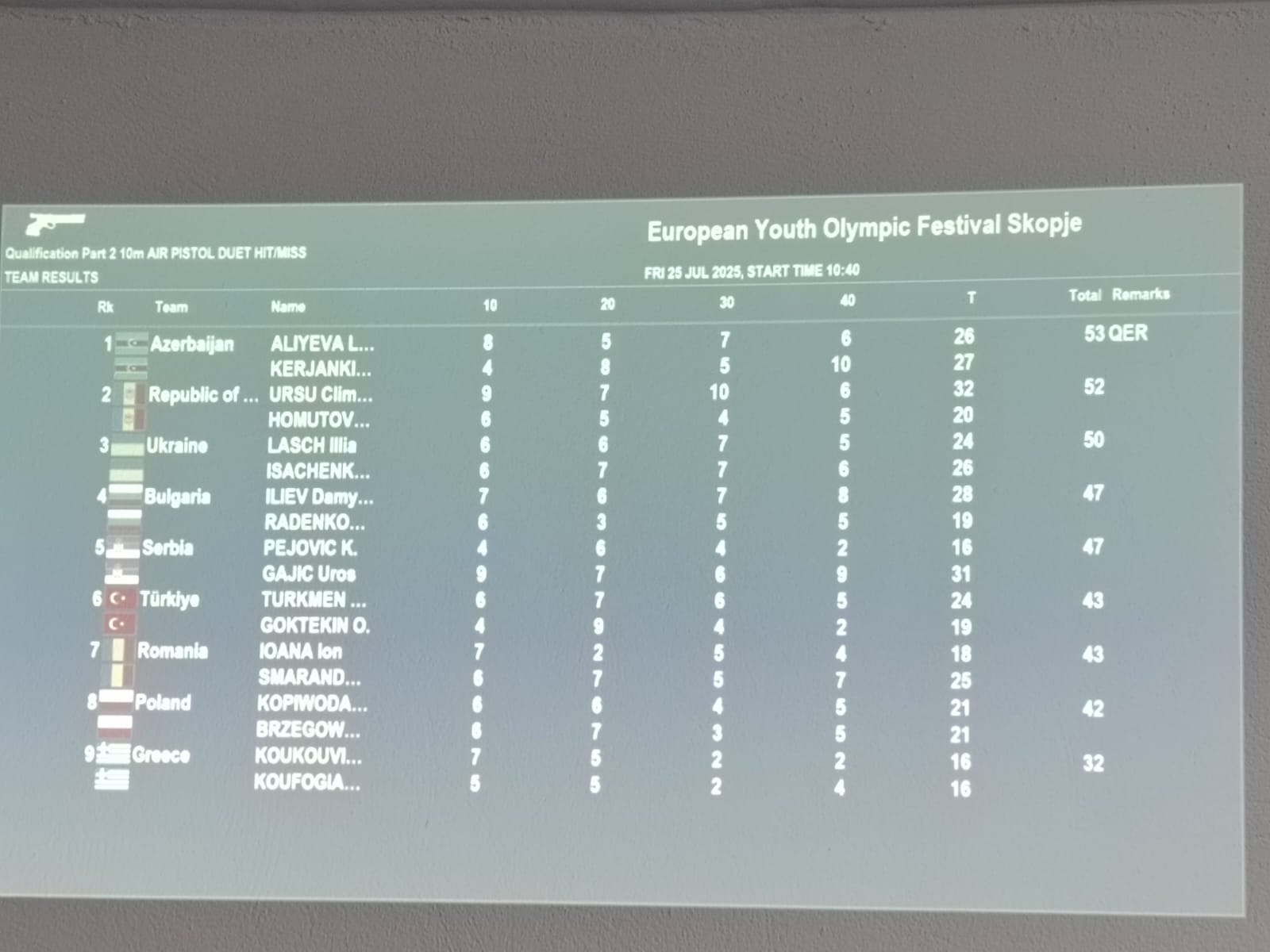 Milli Olimpiya Komitəsinin mətbuat xidməti xəbər verir ki, bu gün 10 metr məsafəyə pnevmatik tapançadan duet yarışlarında ölkəmizi təmsil edən Oleq Kerjankin və Leyli Əliyeva parlaq çıxışla yadda qalıblar. Komanda üzvlərimiz 53 xalla final mərhələsinə vəsiqə qazanıblar. Komandamız bu nəticə ilə həm də Avropa rekordunun müəllifi olub.