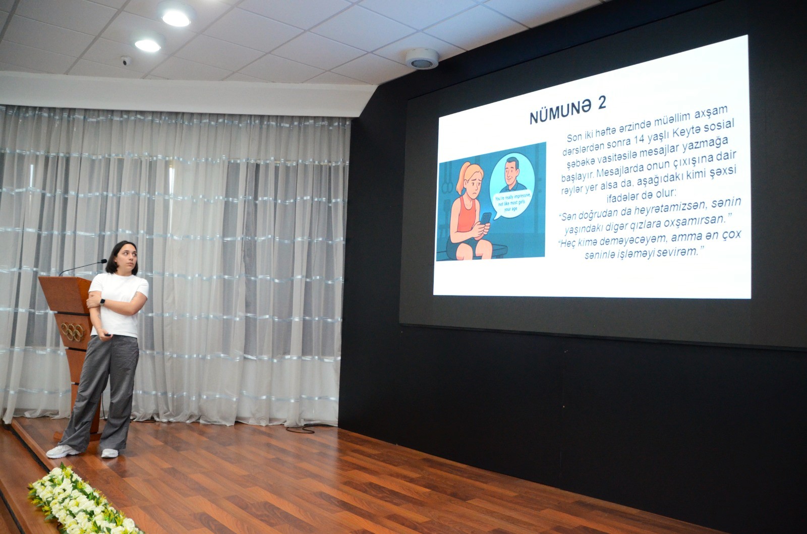 Təhlükəsiz idman üzrə məsləhətçi Ayan Xankişiyeva isə təlim iştirakçılarını qrup tapşırığı üzrə istiqamətləndirərək, onların mövzunu daha dərindən mənimsəməsi və təhlükəsizlik qaydalarını praktik şəkildə tətbiq etməsi ilə yanaşı, müzakirələrin aparılmasına da rəhbərlik edib.