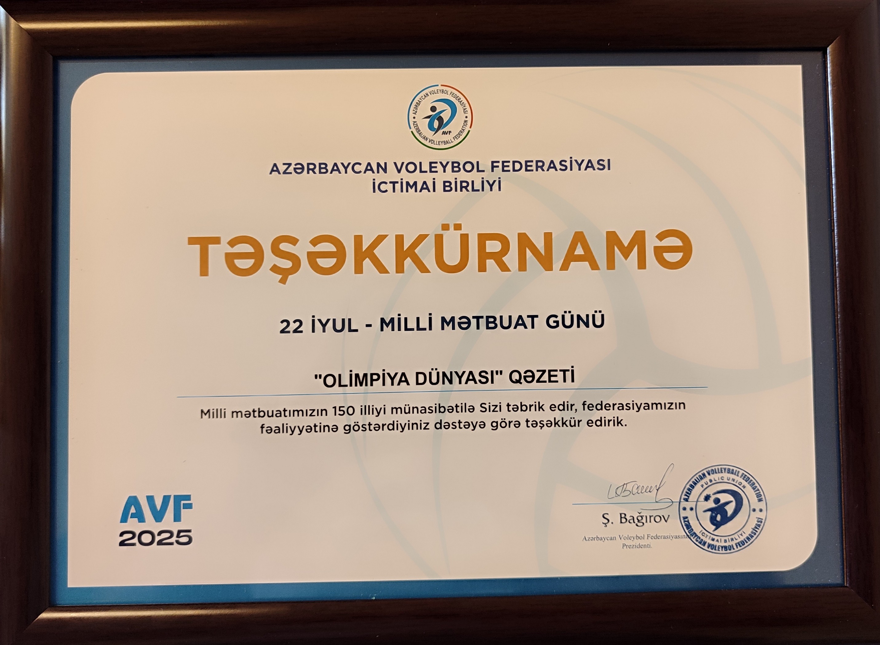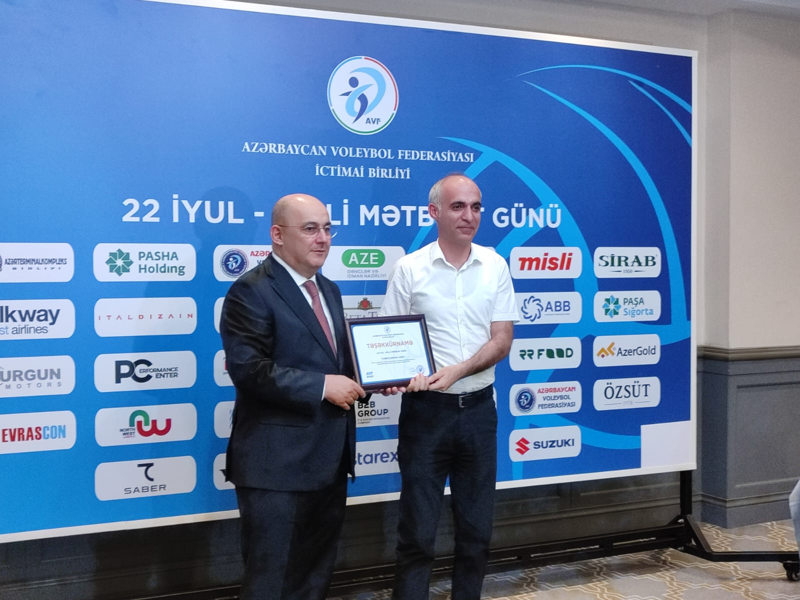 Sonra Azərbaycan Voleybol Federasiyası tərəfindən 22 İyul - Milli Mətbuat Günü ilə bağlı media nümayəndələrinə təşəkkürnamə və xatirə hədiyyələri təqdim olunub.