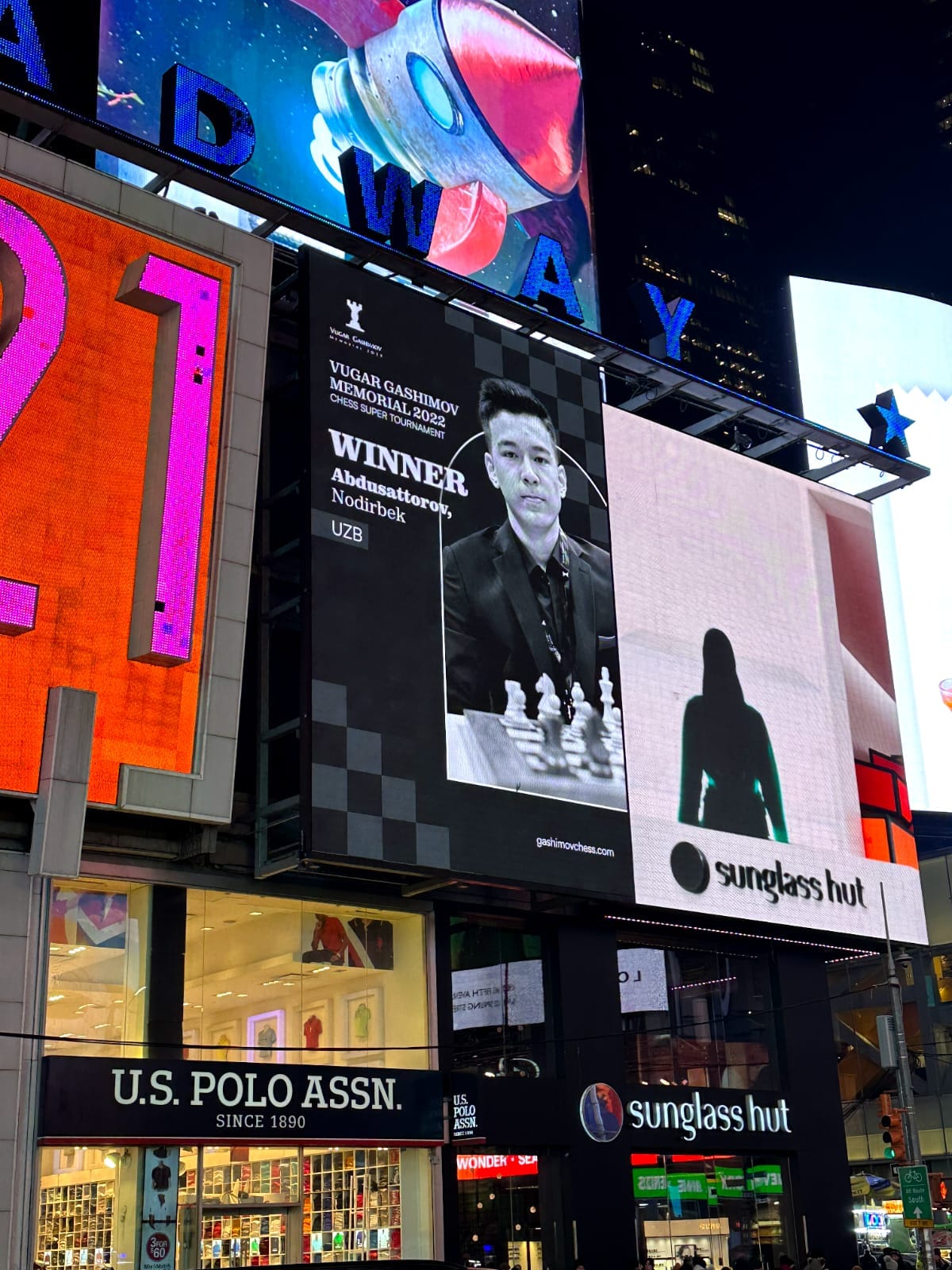 “Vugar Gashimov Memorial-2022”: Nodirbek Abdusattorovun qələbə posteri məşhur "Times" meydanında